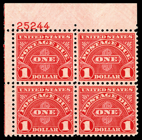 7466 nhbl J87 imagePostage Due, 1956, $1 scarlet (Scott J87), top left plate block of 4, Lovely luminous color, o.g., never hinged, Very Fine.