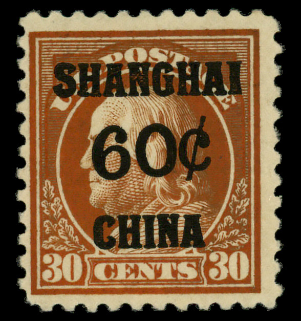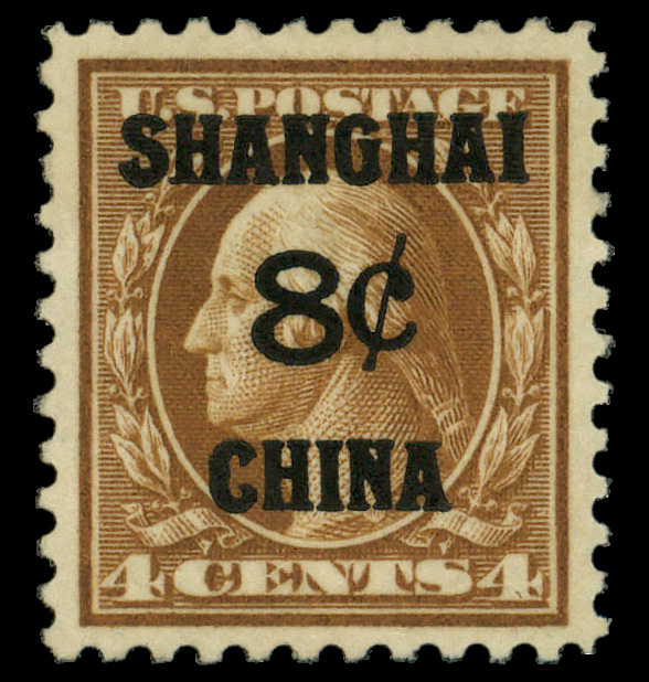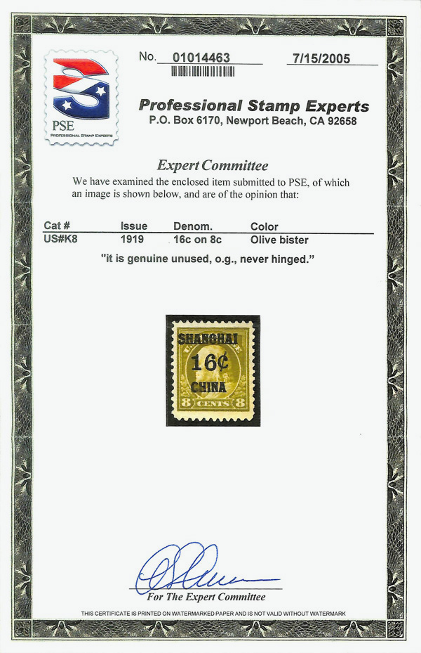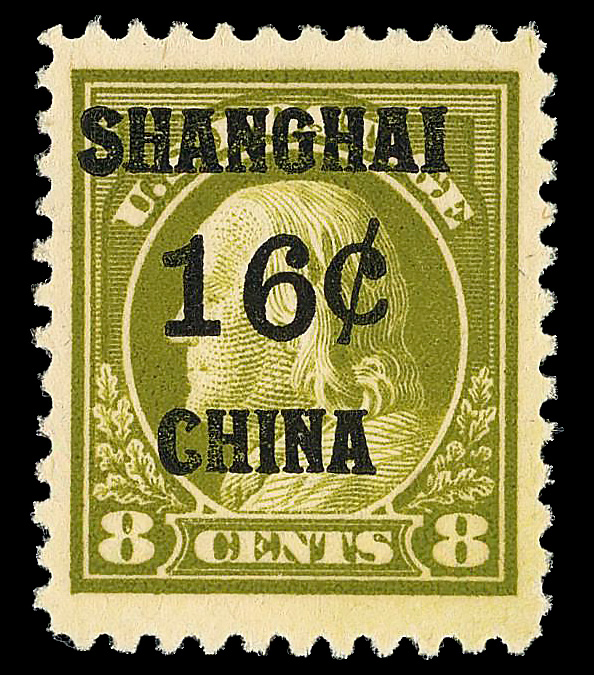 7475 nh K8 imageOffices in China, 1919, 16¢ on 8¢ olive bister (Scott K8), o.g., never hinged, Very Fine, with 2005 P.S.E. certificate.