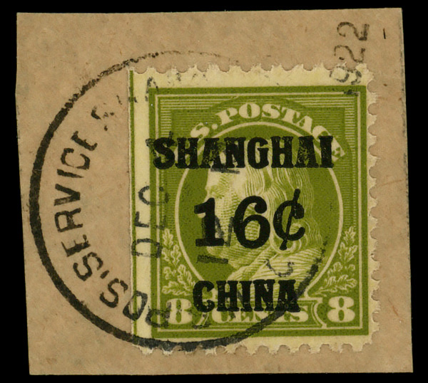 7476 Z K8 imageOffices in China, 1919, 16¢ on 8¢ olive bister (Scott K8), straight edge margin with guide line example, Shanghai Agency cancel, Fine.