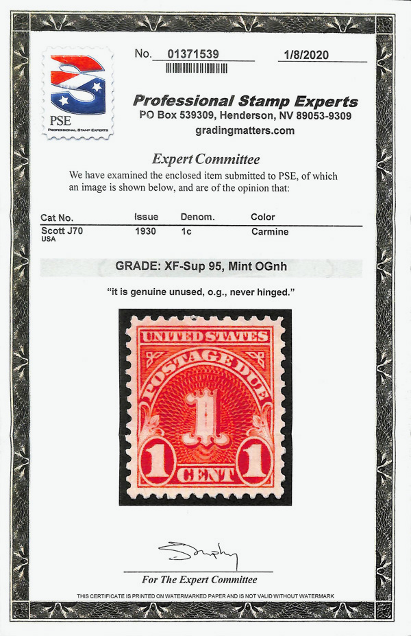 7461 nh J70 imagePostage Due, 1930, 1¢ carmine (Scott J70), o.g., never hinged, Extremely Fine to Superb, with 2020 P.S.E. certificate graded XF-SUP 95.