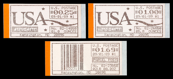 7515 nh CVP11a-CVP15a image1989, 25¢-$8.75 Computer Vended Postage, Kensington MD, machine #82, 1st Day Dated, complete (Scott CVP11a-CVP15a), set of 5, o.g., never hinged, Very Fine.