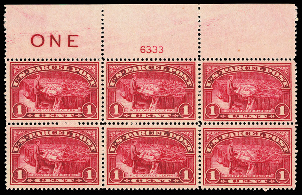 7501 nhbl Q1 imageParcel Post, 1913, 1¢ Post Office Clerk (Scott Q1), top margin plate block of 6 with ONE inscription, Stunning bold tone, o.g., never hinged, Very Fine.