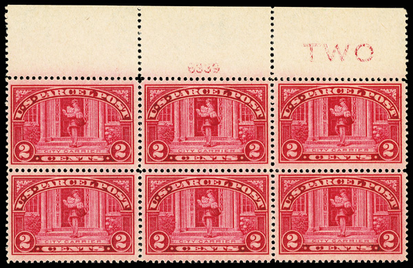 7502 nhbl Q2 imageParcel Post, 1913, 2¢ City Carrier (Scott Q2), top margin plate block of 6 with TWO inscription, Bold glowing hue, o.g., never hinged, Very Fine.
