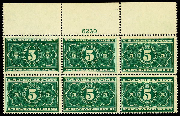7505 nhbl JQ1 imageParcel Post Postage Due, 1913, 1¢ dark green (Scott JQ1), top margin plate block of 6, Gorgeous vibrant impression, o.g., never hinged, Very Fine.