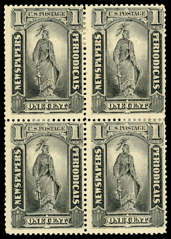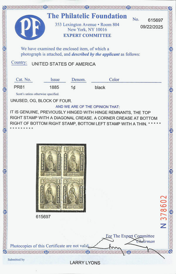 7496 ogbl PR81 imageNewspaper, 1885, 1¢ black, A.B.N.C. printing (Scott PR81), block of 4, o.g., hinge remnants; faults, Fine, with 2025 P.F. certificate for block.