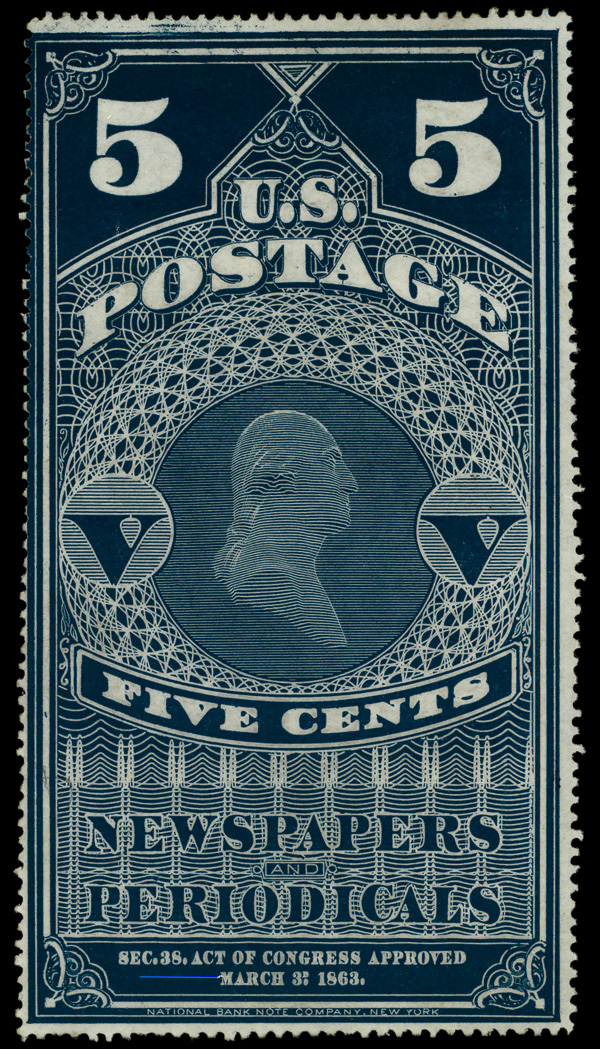 7493 ng PR5 imageNewspaper, 1875, 5¢ dull blue, C.B.N.C. "Hard Paper" Reprint of the 1865 issue (Scott PR5), without gum as issued, Fine.