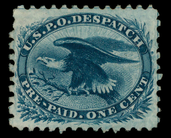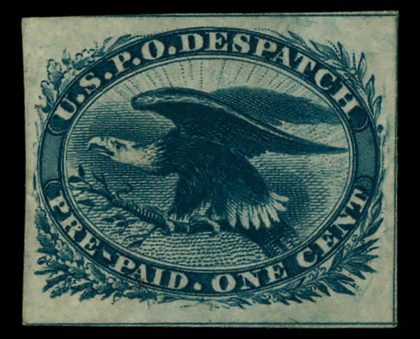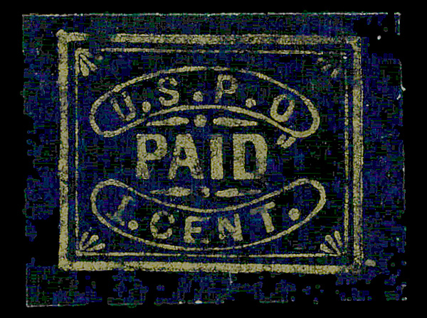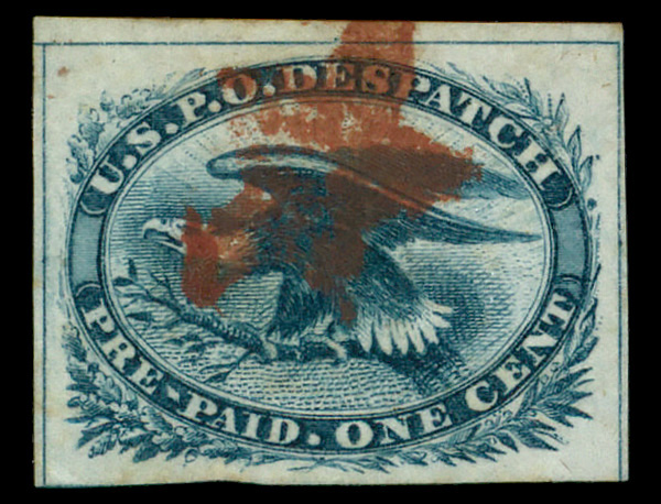 7519 og 7LB11 imagePhiladelphia, Pa., U.S.P.O. Despatch, 1850-52, 1¢ gold on black (Scott 7LB11), o.g., hinge remnant, Very Fine.