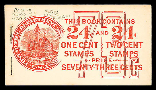 7513 BKnh BK43 imageBooklet, 1914, 73¢, red cover (Scott BK43), complete and unexploded (pencil on front cover), o.g., never hinged, Fine.