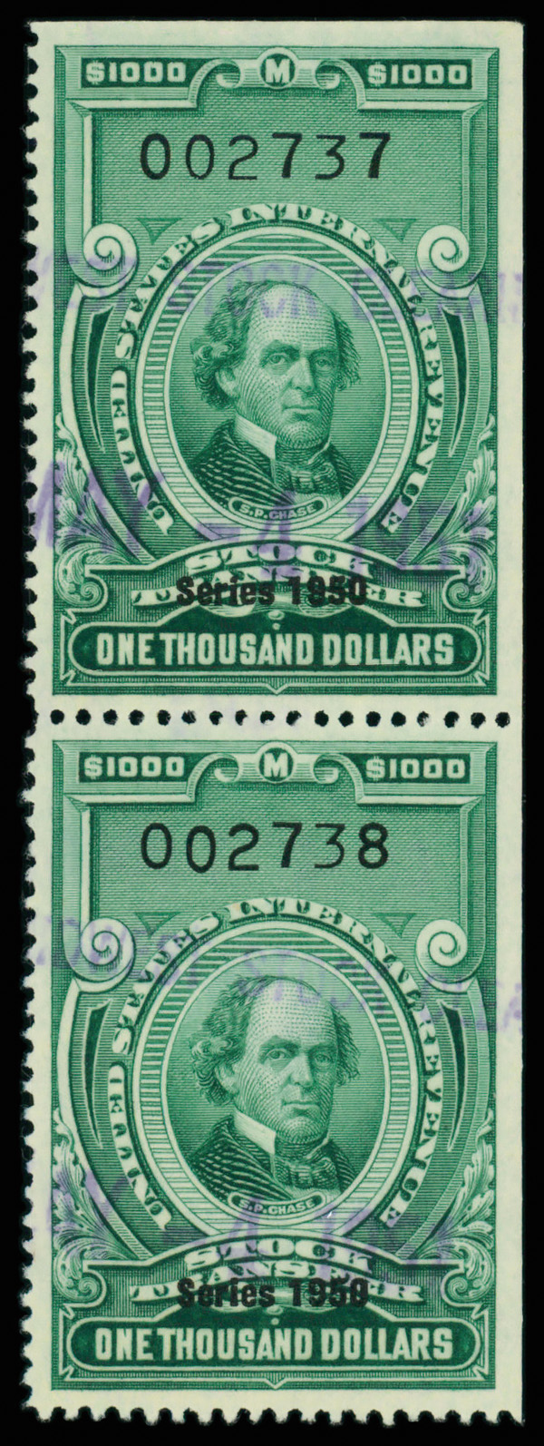 7526 O RD335 imageStock Transfer, 1950, $1,000 Chase (Scott RD335), vertical pair, Extremely Fine.