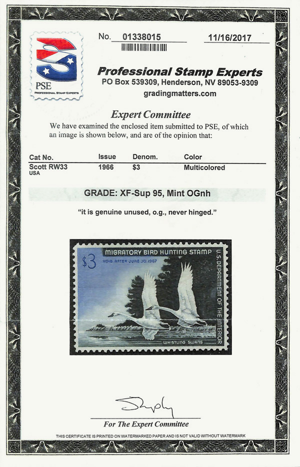 7537 nh RW33 imageFederal Duck Stamp, 1966, $3 Whistling Swans (Scott RW33), o.g., never hinged, bright and sound with rich detail, Extremely Fine To Superb, with 2017 P.S.E. certificate graded XF-SUP 95.