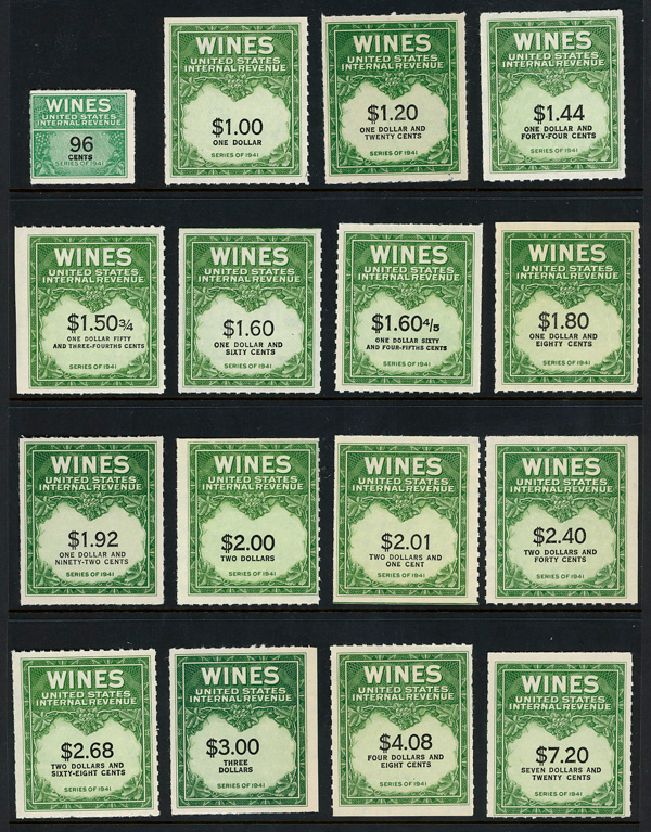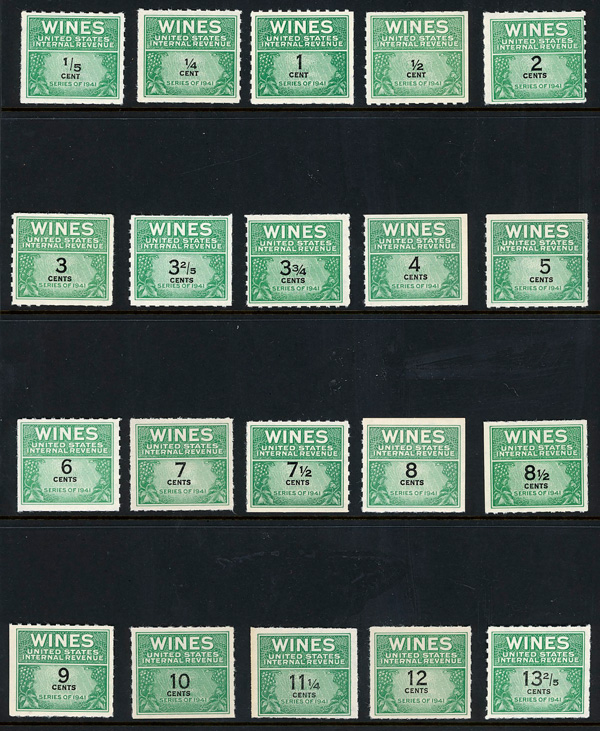 7527 ng RE108//RE203 imageWine Stamps, 1942-54, 1/5¢-$20.00 (Scott RE108//RE203), selection of 59 different, without gum as issued, Fine to Very Fine.