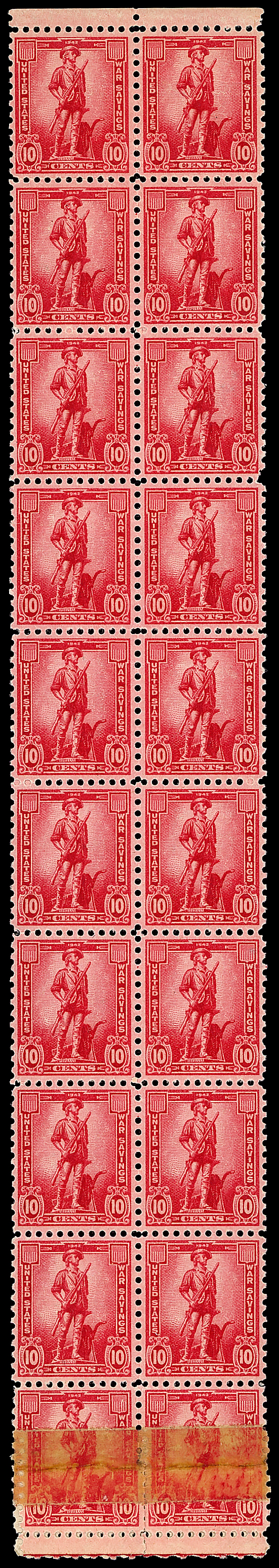 7552 nh WS7 imageWar Savings, 1942, 10¢ rose red, double paper paste-up pair (Scott WS7 var.), o.g., never hinged, the bottom margin pair in a vertical full-pane strip of 20; fresh with bold color, Very Fine, a most unusual variety. (Image) (Image2) (All Images)