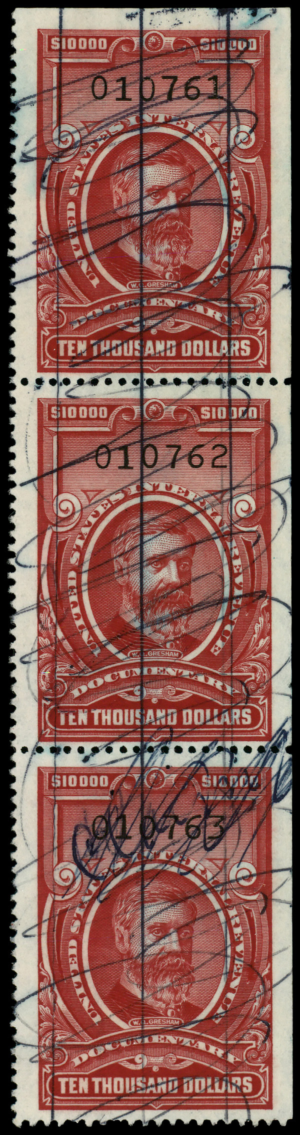 7522 O R732 imageDocumentary, 1958, $10,000 Gresham (Scott R732), strip of 3, Very Fine.