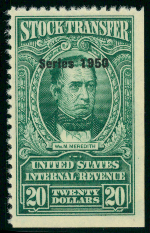 7525 ng RD329 imageStock Transfer, 1950, $20 Meredith (Scott RD329), unused without gum; straight edge at right & bottom, Very Fine.