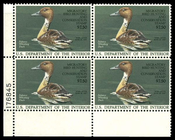 7539 nhbl RW53 imageFederal Duck Stamp, 1986, $7.50 Fulvous Whistling Duck (Scott RW53), plate block of 4, o.g., never hinged, Extremely Fine.