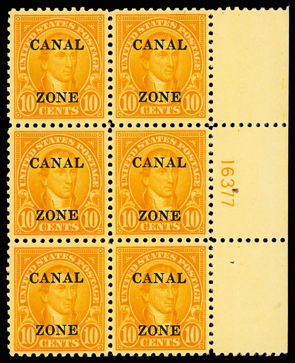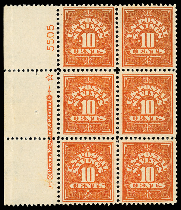 7550 nhbl PS1 imagePostal Savings, 1911, 10¢ orange (Scott PS1), left margin plate block of 6 with star, Deep striking hue, o.g., never hinged, Very Fine.