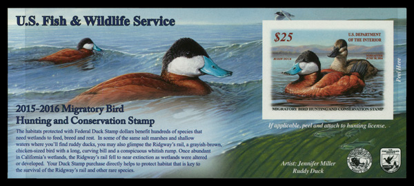 7547 nh RW82A imageFederal Duck Stamp, 2015, $25 Ruddy Ducks, self-adhesive (Scott RW82A), o.g., never hinged, Extremely Fine.