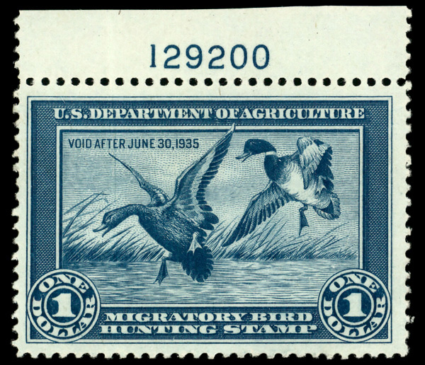 7534 og RW1 imageFederal Duck Stamp, 1934, $1 Mallards (Scott RW1), plate number single, o.g., very lightly hinged (gum crease), Very Fine.
