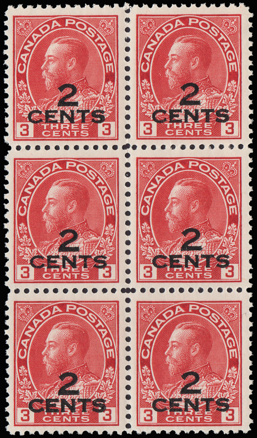 7687 nhbl 140 image1926, King George V "Admiral", 2¢ on 3¢ carmine (Scott 140), a fresh, nicely centered block of 6, o.g., never hinged, Very Fine, with a 2019 P.S.E. certificate.