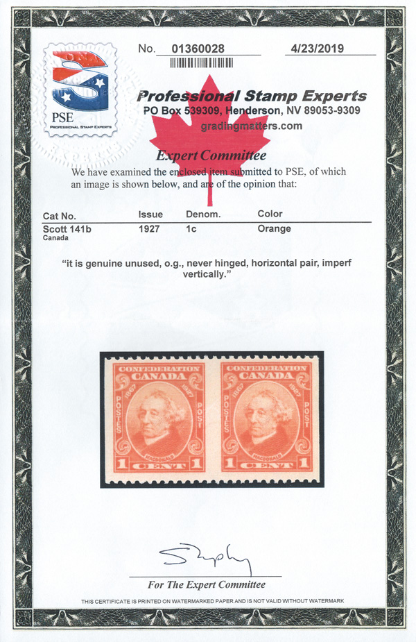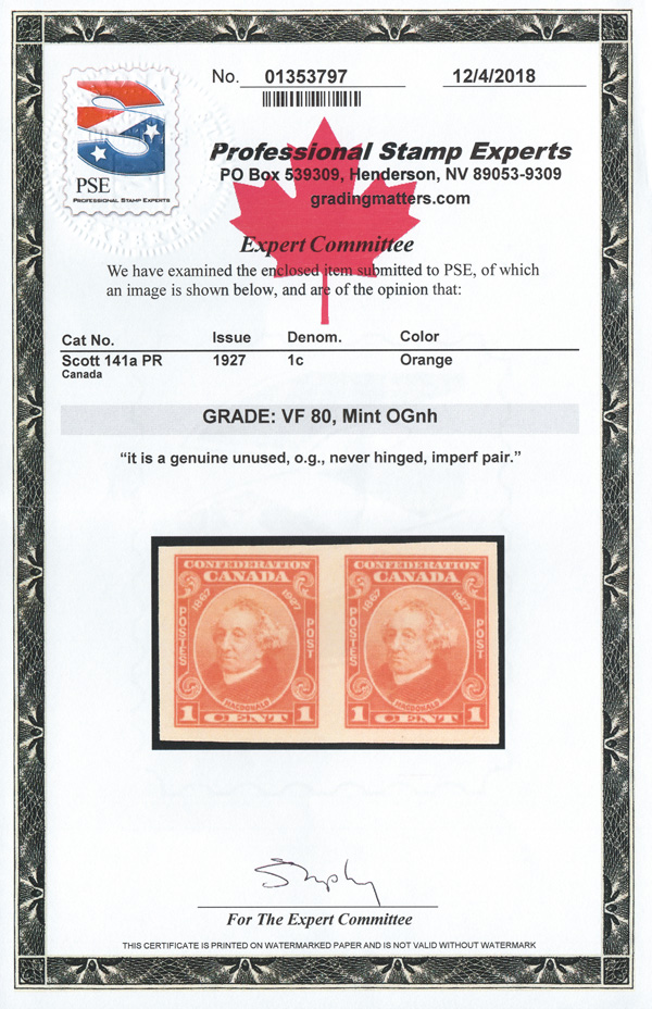 7690 nh 141a image1927, 1¢ Confederation, imperf (Scott 141a), horizontal pair, o.g., never hinged, bright and fresh with nice margins, Very Fine. 250 pairs belived to exist., with a 2018 P.S.E. certificate graded VF 80.