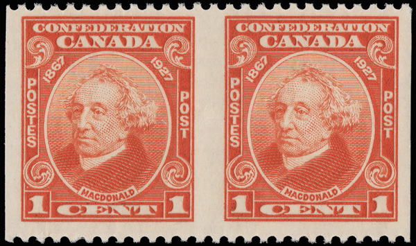 7700 nh 147a image1927, 12¢ Laurier & Mcdonald, imperf (Scott 147a), vertical pair, o.g., never hinged, bright and fresh; but small margin at the right, Fine. 250 pairs belived to exist., with a 2018 P.S.E. certificate.