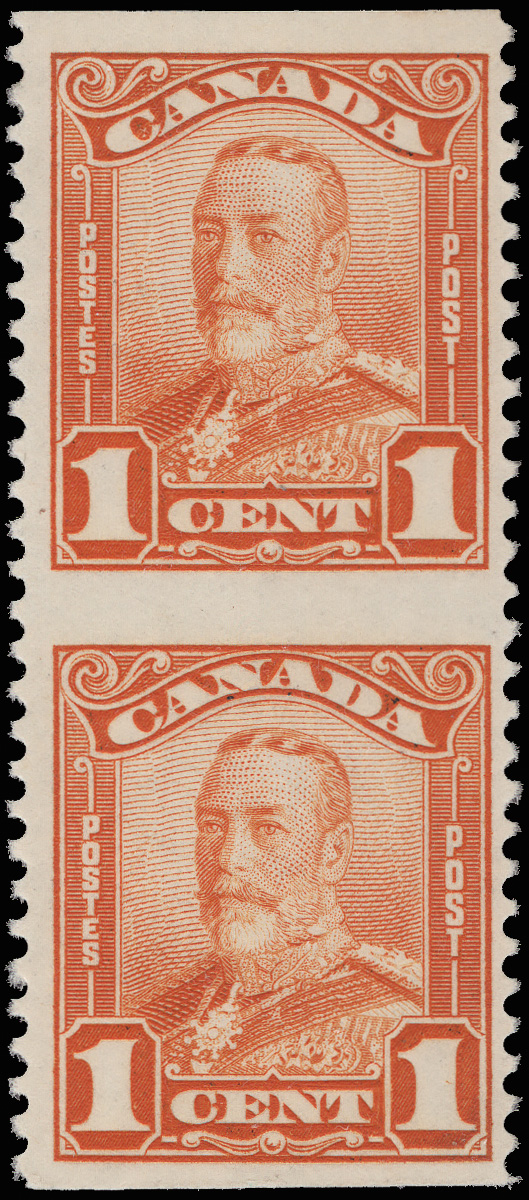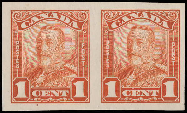 7707 nh 149e image1928, King George V "Scroll", 1¢ orange, vertical pair, imperf. horizontally (Scott 149e), o.g., never hinged, bright and fresh, Fine to Very Fine. 250 pairs belived to exist.