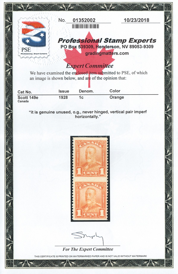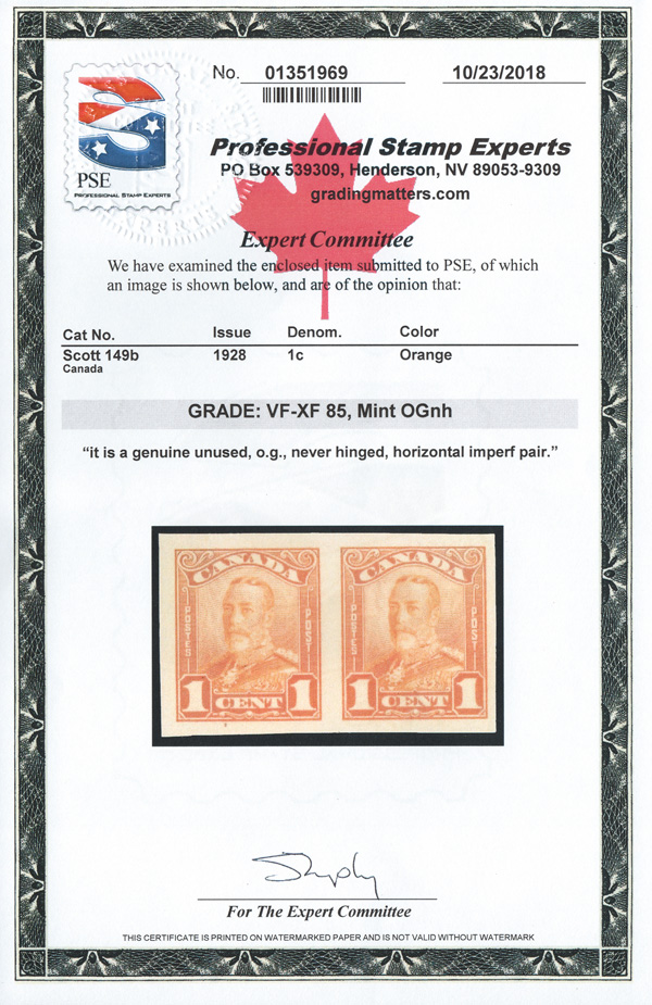 7706 nh 149b image1928, King George V "Scroll", 1¢ orange, imperf (Scott 149b), horizontal pair, o.g., never hinged, large margins and bright color, Very Fine to Extremely Fine. 250 pairs belived to exist., with a 2018 P.S.E. certificate graded VF-XF 85.