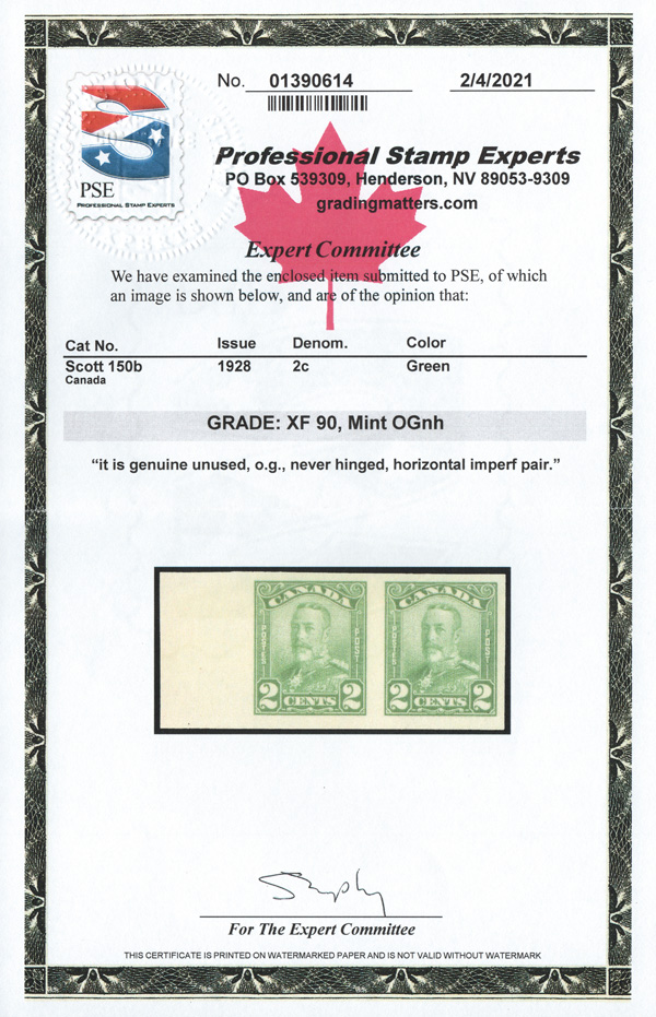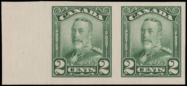 7710 nh 150b image1928, King George V "Scroll", 2¢ green, imperf (Scott 150b), a choice left sheet margin horizontal pair, o.g., never hinged, bright and fresh with large margins, Extremely Fine. Only 250 pairs estimated to have been available., with a 2018 P.S.E. certificate graded XF 90.