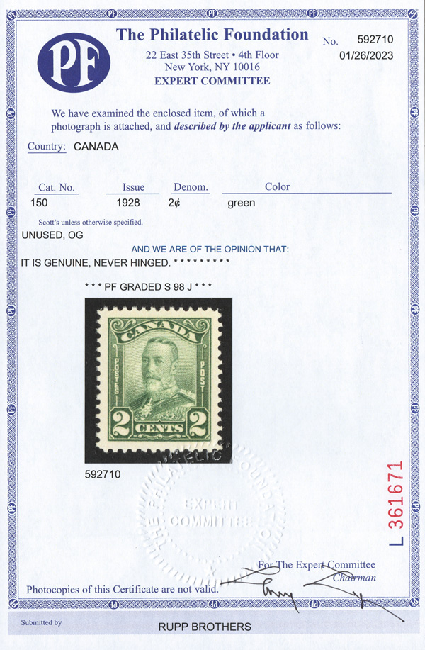 7708 nh 150 image1928, King George V "Scroll", 2¢ green (Scott 150), a truly extraordinary mint single, o.g., never hinged, wonderfully fresh and perfectly centered amid extra large, perfectly symetrical margins, Superb. SMQ does not price any grade higher than XF-Sup 95 ($30), with a 2023 P.F. certificate graded S 98 J.