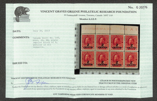 7688 nhbl 140 image1926, King George V "Admiral", 2¢ on 3¢ carmine (Scott 140), plate block of 8, o.g., never hinged, Very Fine to Extremely Fine, with 2013 Greene Foundation certificate.