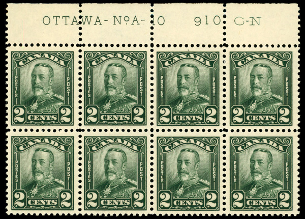7709 nhbl 150 image1928, King George V "Scroll", 2¢ green (Scott 150), plate block of 8, o.g., never hinged, Very Fine.