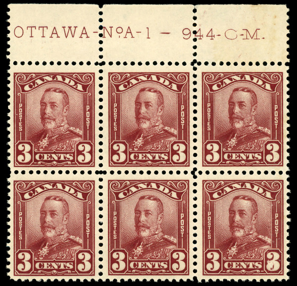 7711 nhbl 151 image1928, King George V "Scroll", 3¢ dark carmine (Scott 151), plate block of 6, o.g., never hinged, Very Fine.