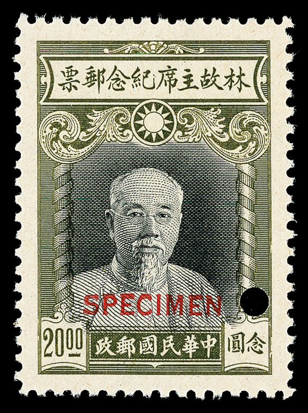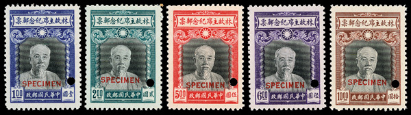 7813 Snh 851-856 image1945, Lin Sen complete, "Specimen" overprints (Chan 851-856. Scott 599-604), with expected proof-like color and clarity, sound and well centered, with red straightline "SPECIMEN" overprint and security punch at right, o.g., never hinged; gum lightly toned as often, Very Fine. (Image) (Image2) (Image3) (Image4) (All Images)