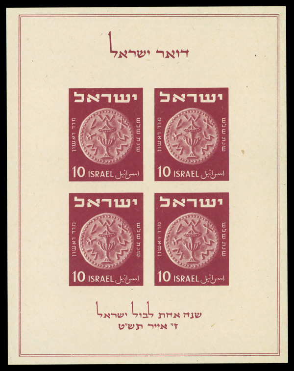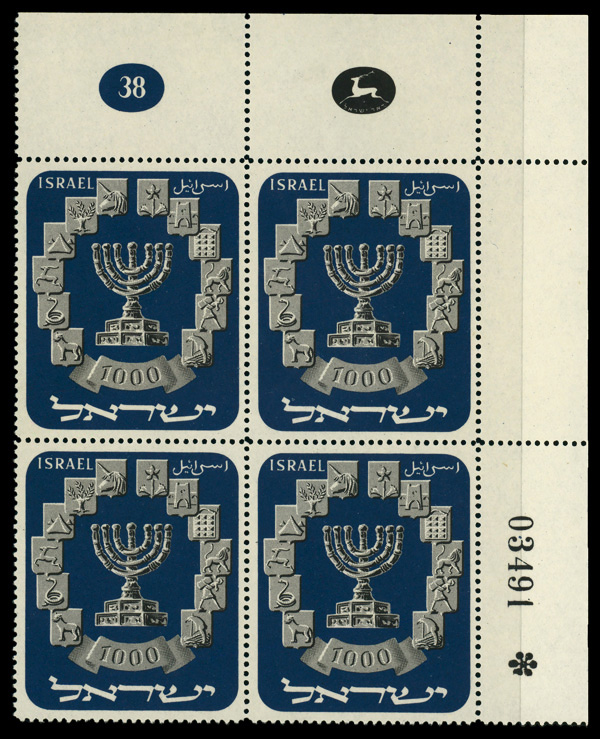 7836 nhbl 55 image1952, 1000p Menorah (Scott 55), plate block of 4, o.g., never hinged, Very Fine.