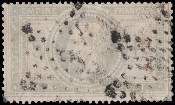 7815 O 37 image1869, Napoleon III Laureate, 5fr gray lilac on lavender (Scott 37), canceled with two Place de la Madeleine "3" Paris stars; handstamp on lower left corner perf bleeds through to the front, otherwise Fine.