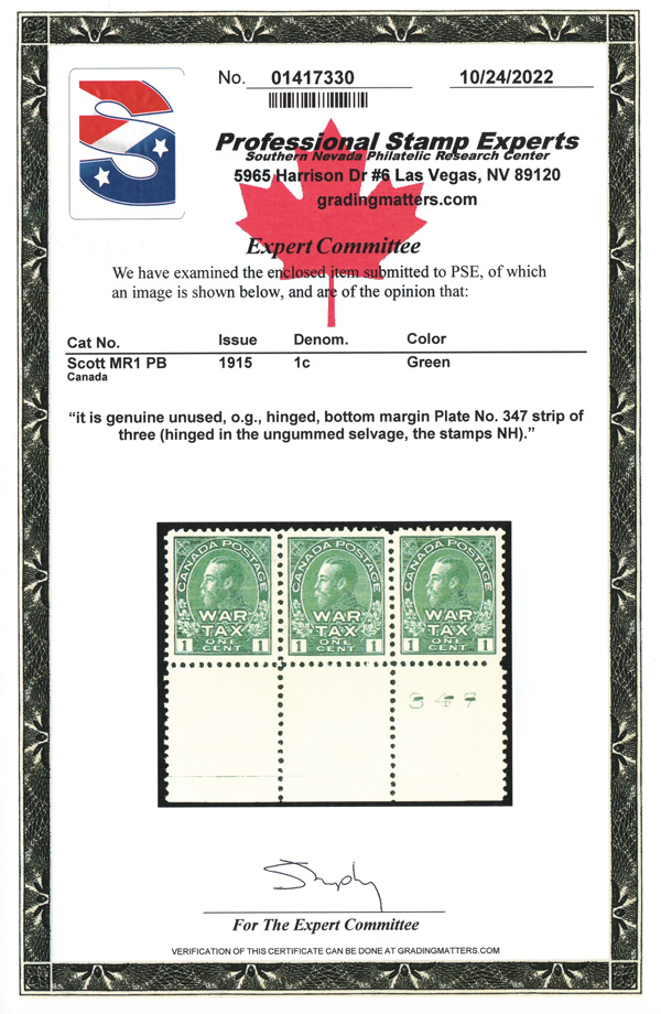 7802 nh/og MR1 imageWar Tax, 1915, King George V "Admiral", 1¢ green (Scott MR1), bottom sheet margin strip of 3 with Plate No. 347, o.g., hinged in the ungummed part of the selvage, stamps never hinged, bright, fresh and incredibly well centered, Extremely Fine, with a 2022 P.S.E. certificate.