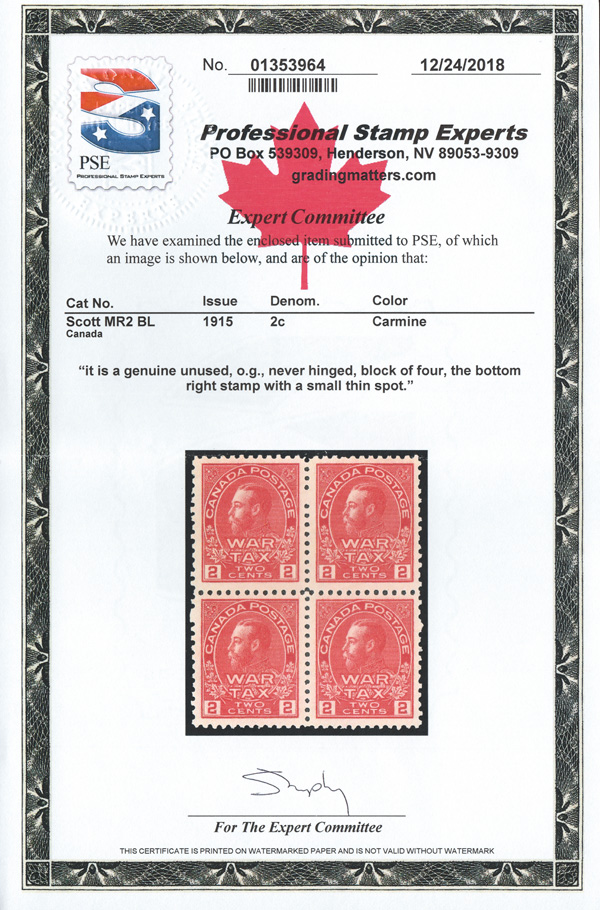 7803 nhbl MR2 imageWar Tax, 1915, King George V "Admiral", 2¢ carmine (Scott MR2), block of 4, o.g., never hinged, fresh and well centered; the lower right stamp with a small thin, otherwise Very Fine.
