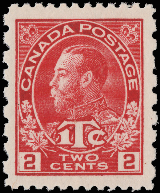 7806 nh MR5 imageWar Tax, 1916, King George V "Admiral", 2¢+1¢ carmine, type I, perf. 12 x 8 (Scott MR5), o.g., never hinged, fresh, bright and beautifully centered, Very Fine to Extremely Fine, with a 2019 P.S.E. certificate graded VF-XF 85.