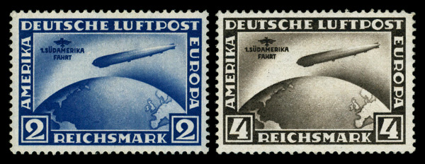 7823 og C38-C39 imageAirmail, 1930, 2m-4m So. America Flight Zeppelins complete (Scott C38-C39), o.g., lightly hinged, Very Fine to Extremely Fine.