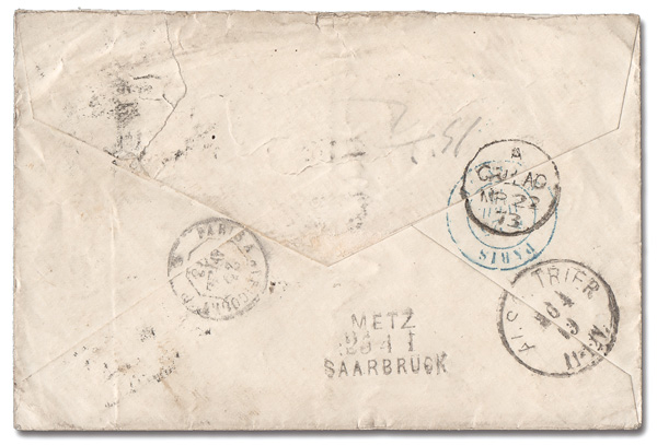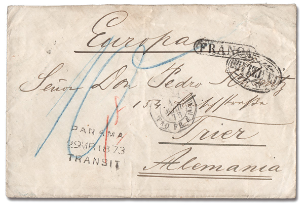 7812 cover   image1873 Stampless cover from La Chimba to Trier, Germany, postmarked with an ornate "CANCELADO" oval of La Chimba,along with a boxed "FRANCA"; routed through Callao, Peru receiving a Mar 27 c.d.s. of the Callao British post office cds on the reverse; the cover then went via Panama receiving the three-line "PANAMA/29MR1873/TRANSIT" hs and was given to a French packet for transit to Europe with a partial Apr 1 "Panama/Paq Fr. A No. 2" octagonal datestamp., "10" blue crayon due marking, Paris (2) and Trier backstamps; minor cover wrinkles, Very Fine. Rare combination cover of the Bolivian and British post offices with addition of the unusual usage of a French packet to Europe., Ex-Ortiz-Patino. (Image) (Image2) (All Images)