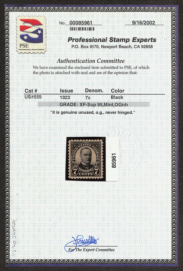 7207 nh 559 image1923, 7¢ McKinley (Scott 559), post office fresh appearance, o.g., never hinged, Extremely Fine to Superb, with 2002 P.S.E. certificate graded XF-SUP 95.