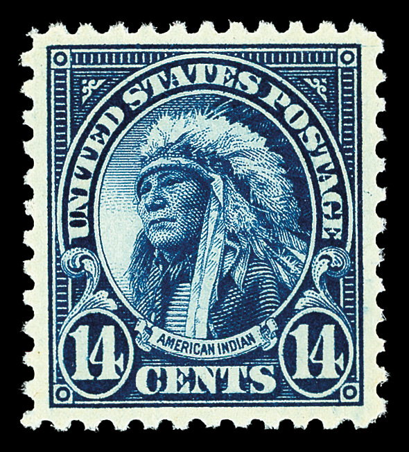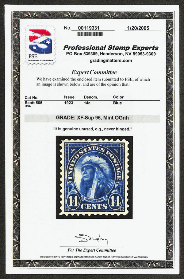 7220 nh 565 image1923, 14¢ American Indian (Scott 565), remarkably vivid impression, o.g., never hinged, Extremely Fine to Superb, with 2005 P.S.E. certificate graded XF-SUP 95.