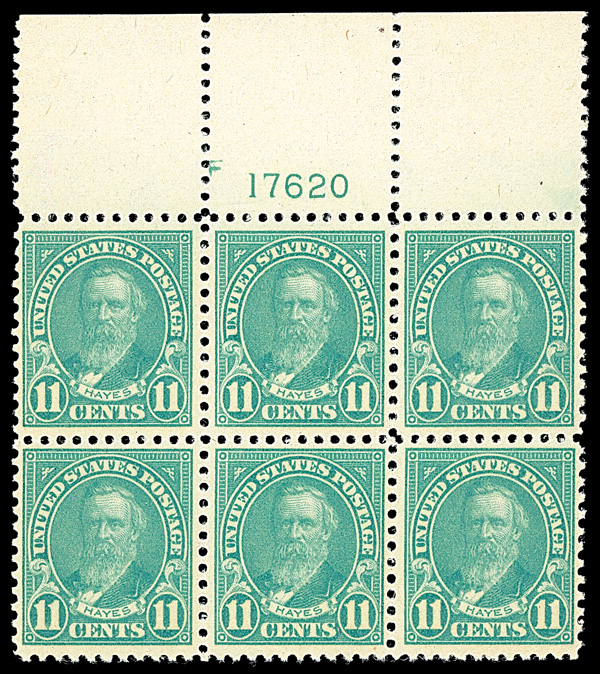 7216 nhbl 563 image1922, 11¢ Hayes (Scott 563), full wide top margin plate number F17620 block of 6, o.g., never hinged, Post Office fresh with bright color on matching paper, sound and nicely centered throughout, Choice Very Fine.
