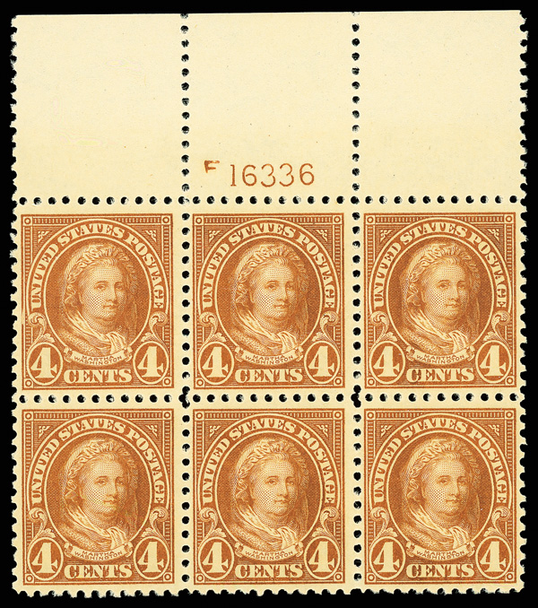 7203 nhbl 556 image1923, 4¢ Martha Washington (Scott 556), top margin plate block of 6, Exceptionally rich color, o.g., never hinged, Very Fine.