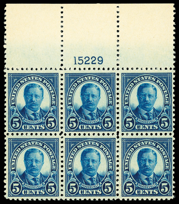 7205 nhbl 557 image1922, 5¢ Roosevelt (Scott 557), top margin plate block of 6, Magnificent rich hue, o.g., never hinged, Fine to Very Fine.