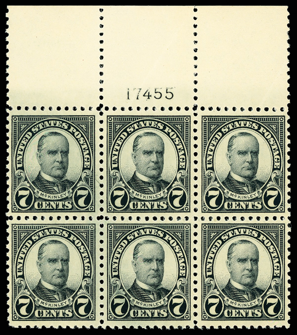 7208 nhbl 559 image1923, 7¢ McKinley (Scott 559), top margin plate block of 6, Wonderfully vibrant impression, o.g., never hinged; light gum bend on upper right stamp, Very Fine.