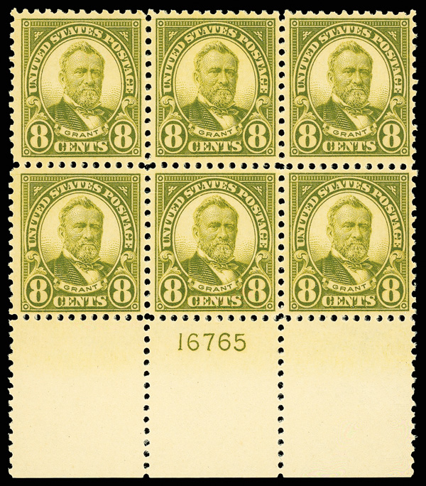 7211 nhbl 560 image1923, 8¢ Grant (Scott 560), bottom margin plate block of 6, Bold glowing tone, o.g., never hinged, Fine to Very Fine.