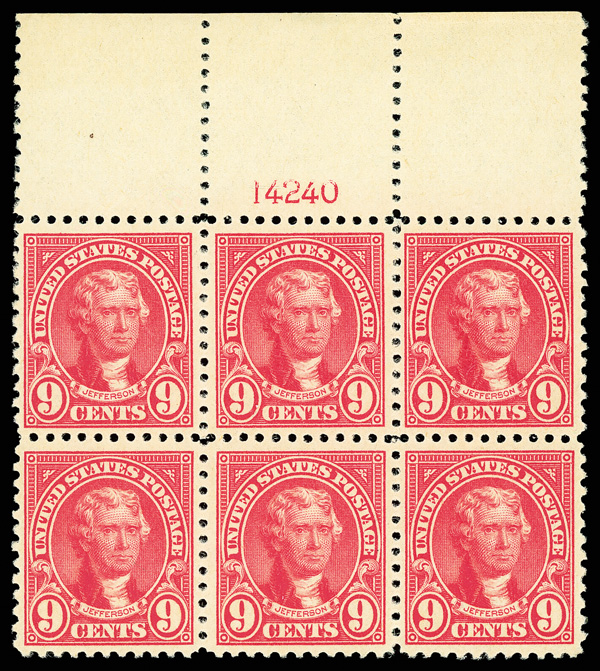 7212 nhbl 561 image1923, 9¢ Jefferson (Scott 561), top margin plate block of 6, Brilliant rich tone, o.g., never hinged, Very Fine.