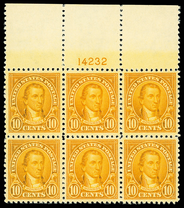 7214 nh/ogbl 562 image1923, 10¢ Monroe (Scott 562), top margin plate block of 6, Well-proportioned margins, o.g., top center stamp lightly hinged (5 stamps never hinged), Very Fine.