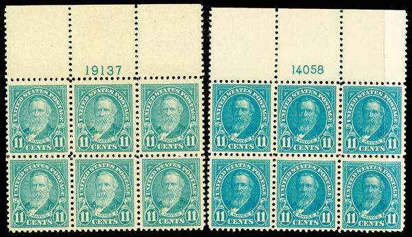 7215 nhbl 563, 563a image1922, 11¢ Hayes, Greenish blue and Light bluish green (Scott 563, 563a), top margin plate blocks of 6, Wide spacing appeal, o.g., never hinged, Very Fine with several exceptionally well centered singles.